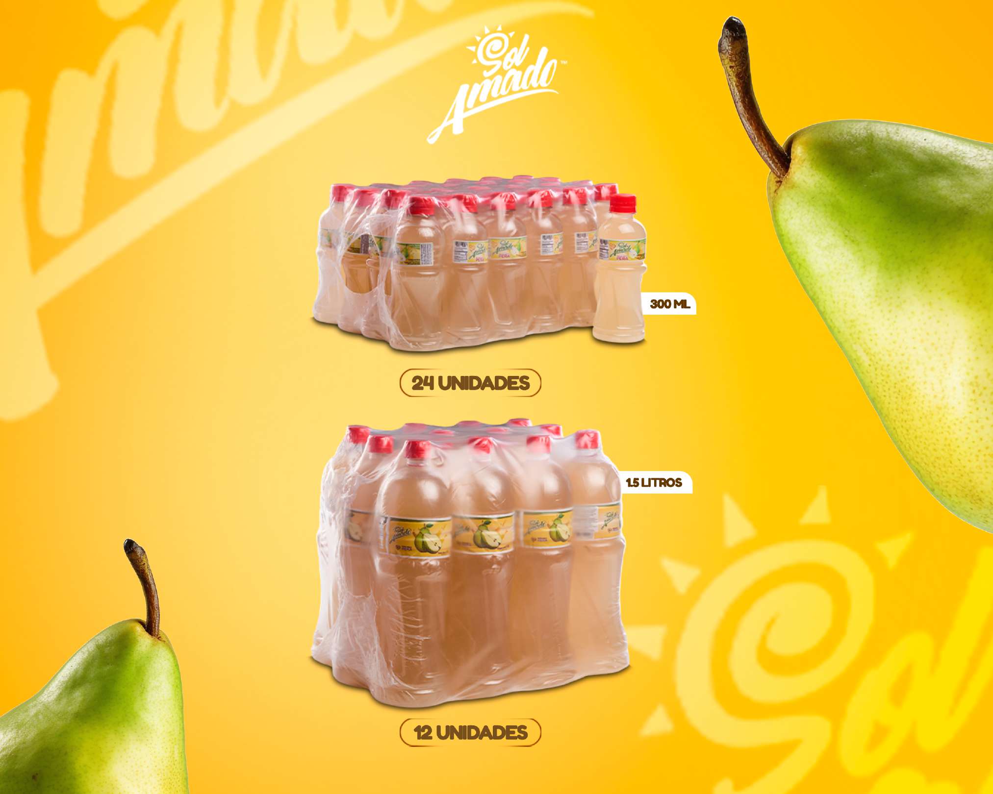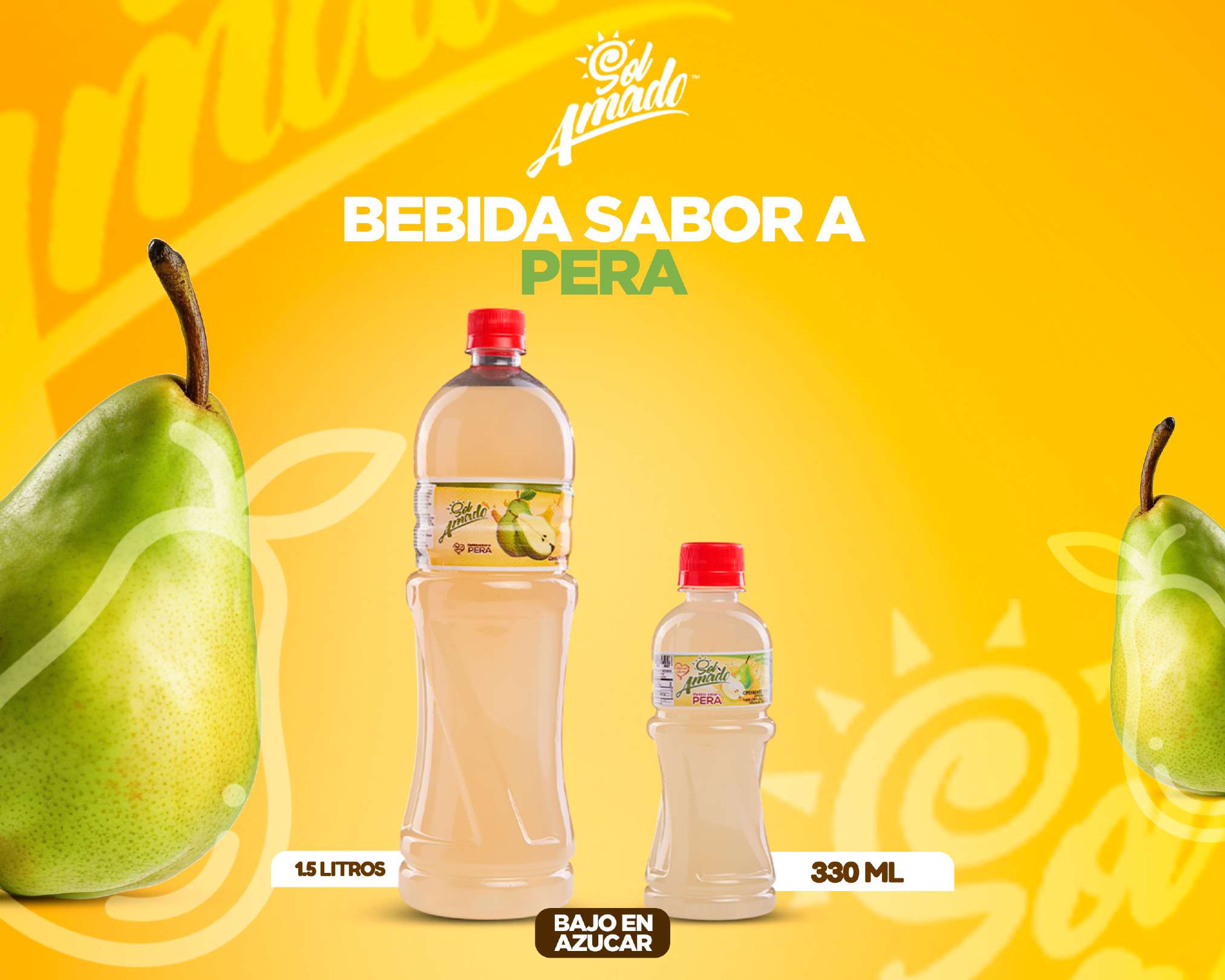 Agua potable tratada, azúcar, goma xántana, ácido cítrico, sabor idéntico al natural de pera, benzoato de sodio, sorbato de potasio, colorantes caramelo y tartrazina.